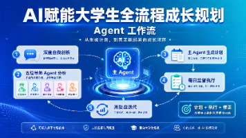 本项目聚焦大学生成长规划场景,设计了一套可真正落地执行的 Agent 工作流,旨在解决传统 AI 规划“只会生成计划、难以长期坚持”的问题。整体流程由深度自我剖析与访谈开始,通过五位导师 Agent 从校园成长、专业学业、职业发展、心理能量和时间执行五个维度进行分析,再由主 Agent 统一生成学期、周度与每日计划,并结合监督 Agent 的日常打卡和周复盘 Agent 的迭代优化,形成“规划—执