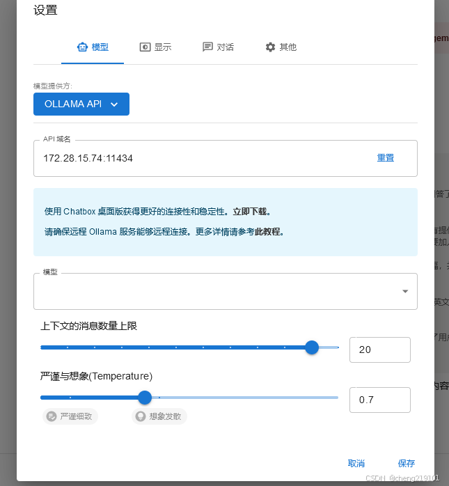本地部署完成后,我们需要在一个可视化的界面上使用,网页上使用的方案有多种,包括:Chatbox、docker+Open WebUI等,这些坑我踩过了,本地部署本地访问可行,修改成目标IP后无法获取到模型选项。