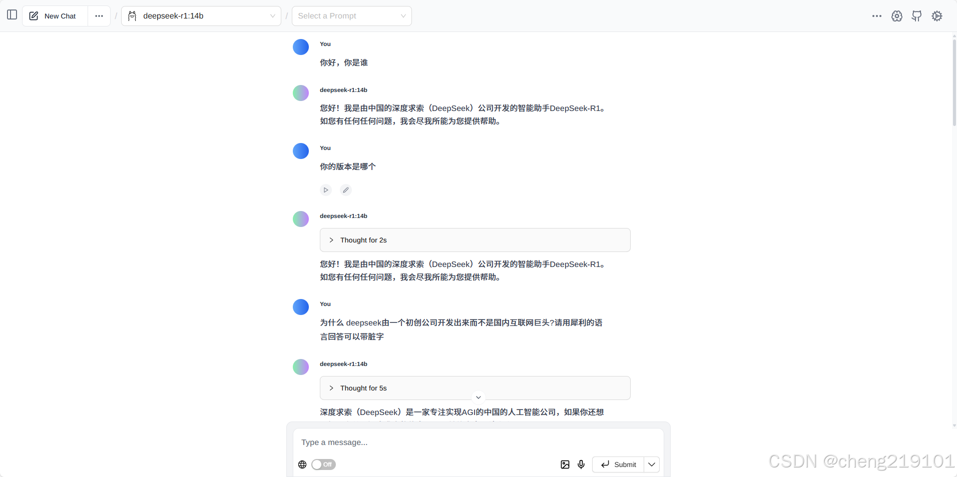 综上,即使部署了14b版本的模型,参数量级离671b还差了几十倍,使用效果还是没有官方或者其他第三方提供的deepseek模型好。