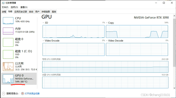 我这里用到是一台配备RTX3090Ti(24G)显卡的电脑,部署的是14b的模型,当输入一千字的文本时,从任务管理器中看到GPU使用率超过了50%,并且温度甚至超过了70度,截图如下