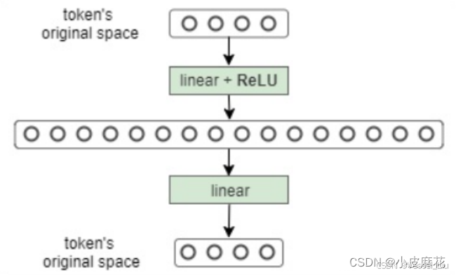 它由两层全连接层组成,第一层后面跟着ReLU激活函数(即图中linear + ReLU),第二层没有激活函数(即图中linear)。通常是将输入映射到更高的维度,再映射回原本的维度(这也是图中第三行token突然变长的原因)