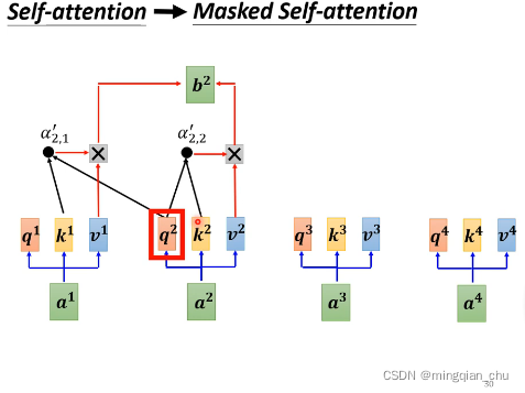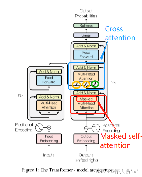 现在我们就可以完全明白decoder了嘛?答案是否定的。你会发现Multi-Head Attention前加了一个masked,还多了一个CrossAttention,这两个是什么呢?