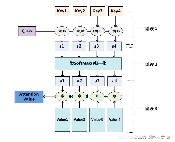 第一阶段:据Query和Key计算两者之间的相关性或相似性,得到注意力得分;