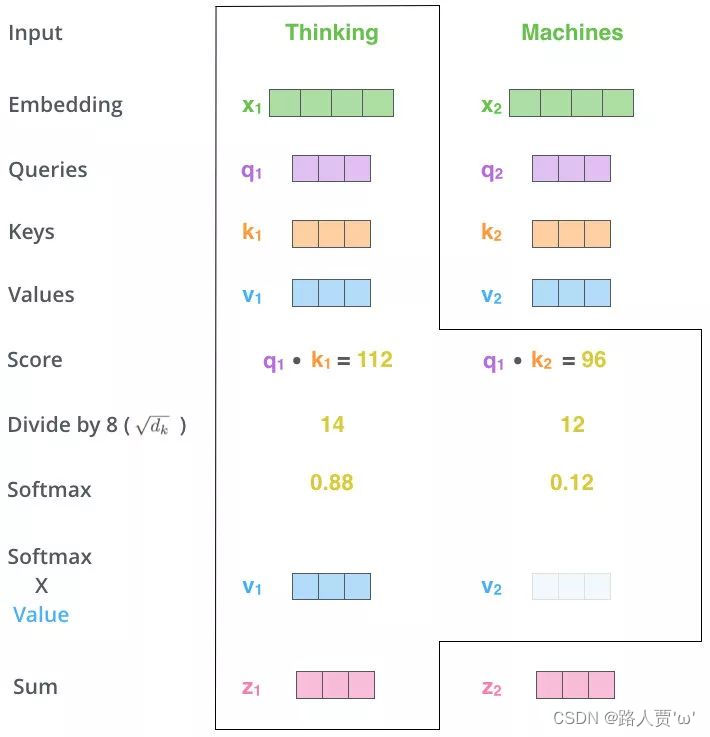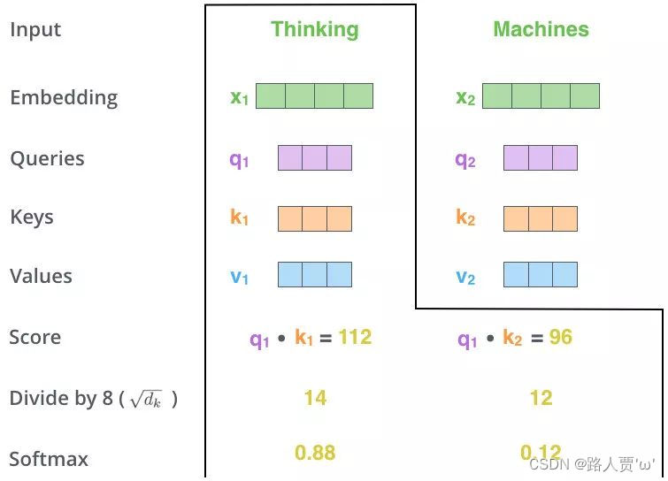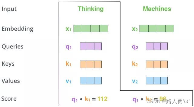 - 利用得到的Q和K计算每两个输入向量之间的相关性,一般采用点积计算,为每个向量计算一个score:score =q · k