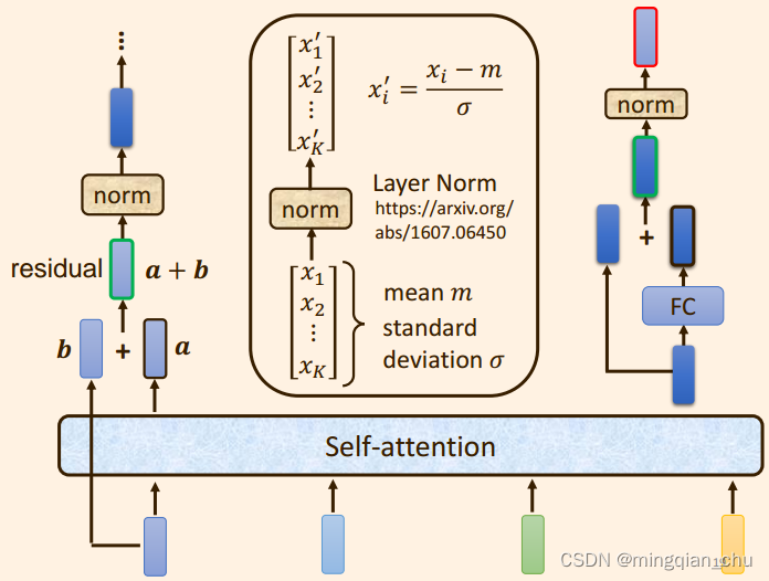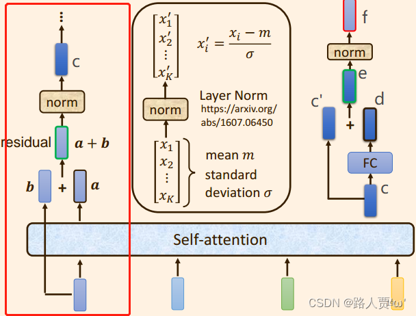 - 原始的输入向量,一个记过自注意力机制层进行重要信息提取得到向量a,另一个不做任何处理(向量b)与向量a残差连接,得到向量a+b
