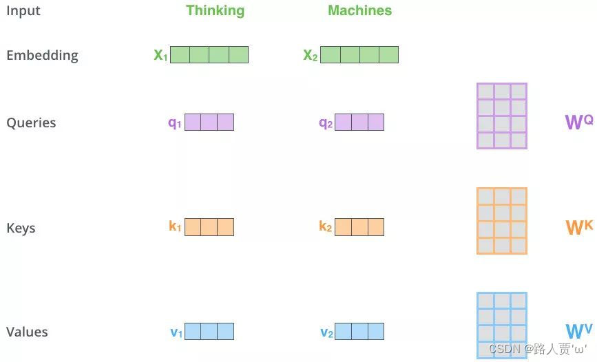 对于每一个向量x,分别乘上三个系数,wq,wk,wv,得到的Q,K和V分别表示query,key和value(三个W就是我们需要学习的参数)