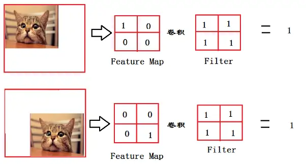 比如下面这个猫猫识别/分类任务,我们对输入的猫猫进行卷积运算获得特征图,我们先不讨论卷积核具体如何提取特征,但我相信我们都可以认可位于左上角的猫猫,通过卷积提取出来的特征会大多位于特征矩阵的左上角;位于右下角的猫猫会大多位于右下角。