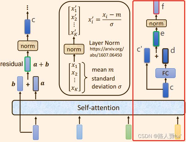- 向量e 通过LayerNorm输出向量f;(此时的相量f便是每一个块的输出)