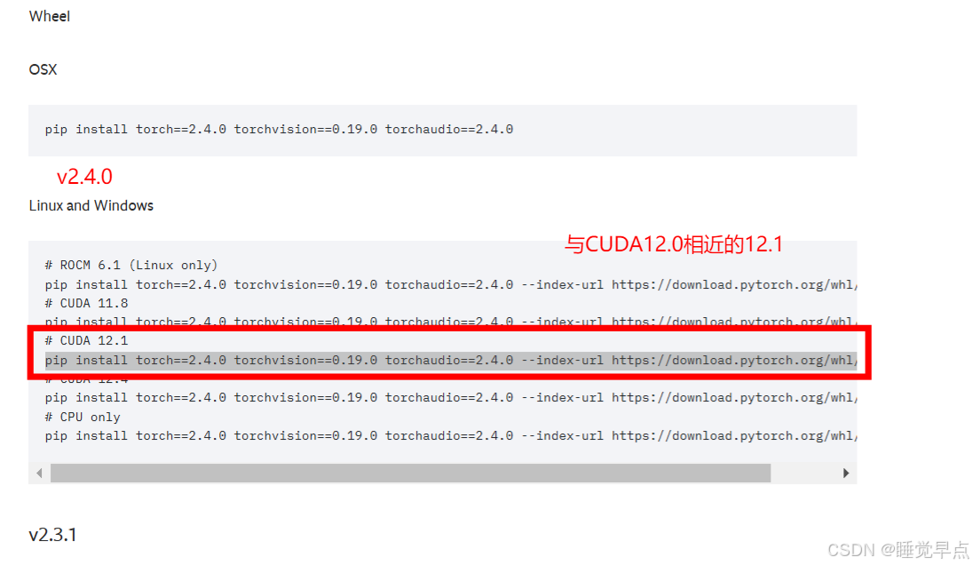但是!!!我的环境:python 3.8 cuda 12.0,不能下载最新的稳定版本pytorch。根据对应关系,去历史版本(Previous PyTorch Versions | PyTorch )中下载pytorch2.4的版本。