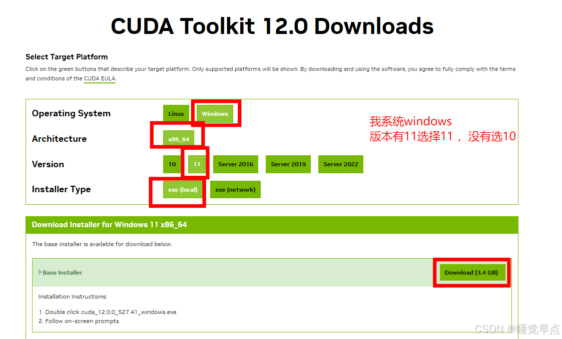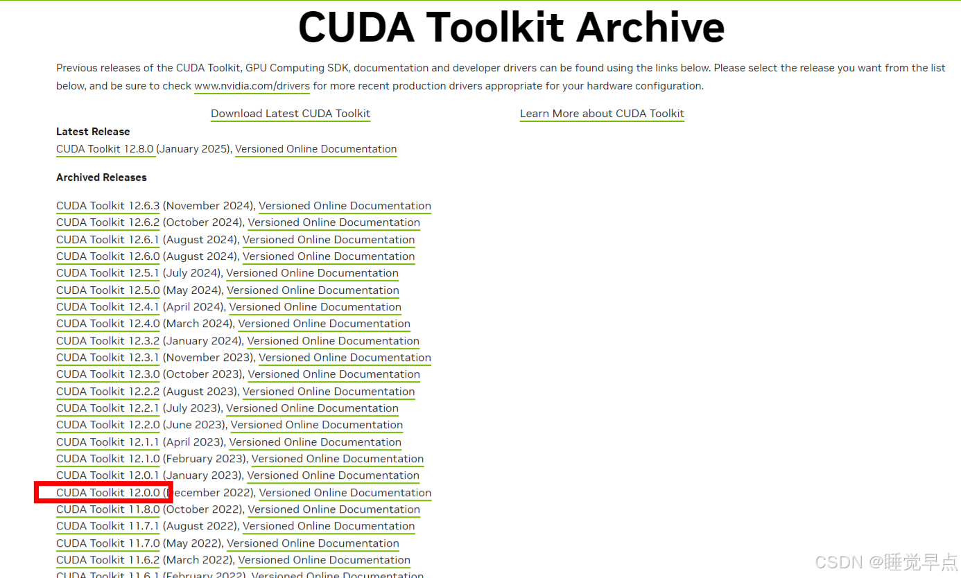 注意:下载的CUDA版本必须小于最高支持的版本号。我的CUDA版本为12.5,我要下载小于或者等于12.5都是可以的,我安装12.0。