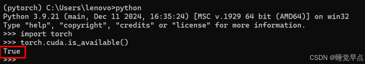 (2)虚拟环境的命令行中输入python,启动python环境;再输入以下代码,进行检测环境是否配置成功,出现true,成功!