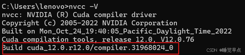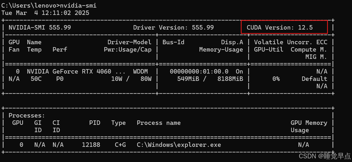 win + r ,输入cmd 进入终端,输入指令查看CUDA版本,他表示英伟达驱动支持的cuda最高版本: