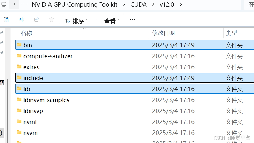 我选了精简安装,即使自定义了安装位置,CUDA还是安装到了C:\Program Files\NVIDIA GPU Computing Toolkit\CUDA\v12.0 这里。