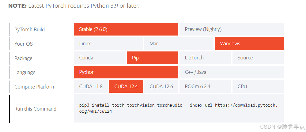 环境:创建了python=3.9的虚拟环境,cuda为12.0,准备下载Pytorch2.4。