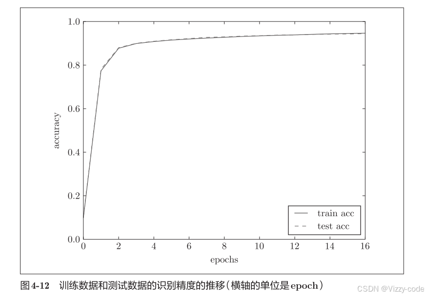 在上面的代码中,增加了对训练集和测试集计算精度的代码。每经过一个 epoch,就对所有的训练数据和测试数据计算识别精度,并记录结果。之所以要计算每一个 epoch 的识别精度,是因为如果在 for 语句的循环中一直计算识别精度,会花费太多时间。