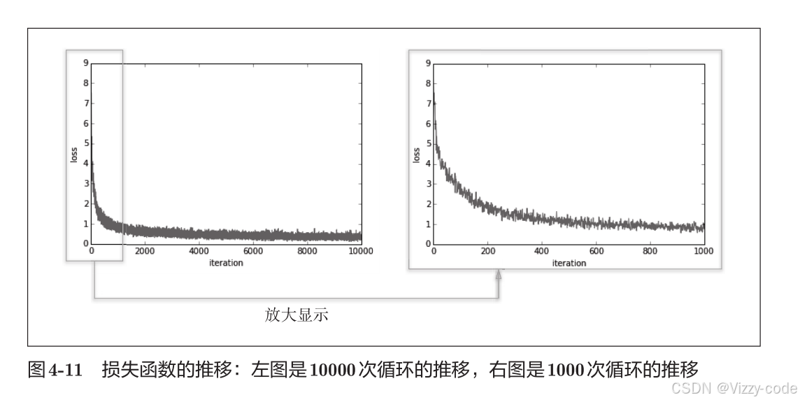 观察图 4-11,可以发现随着学习的进行,损失函数的值在不断减小。这是学习正常进行的信号,表示神经网络的权重参数在逐渐拟合数据。也就是说,神经网络的确在学习!通过反复地向它浇灌(输入)数据,神经网络正在逐渐向最优参数靠近。