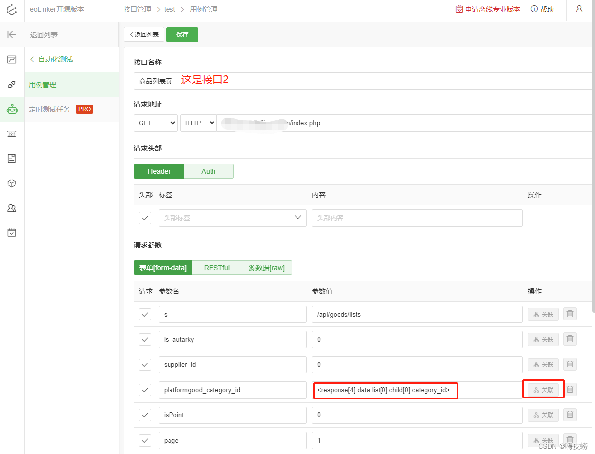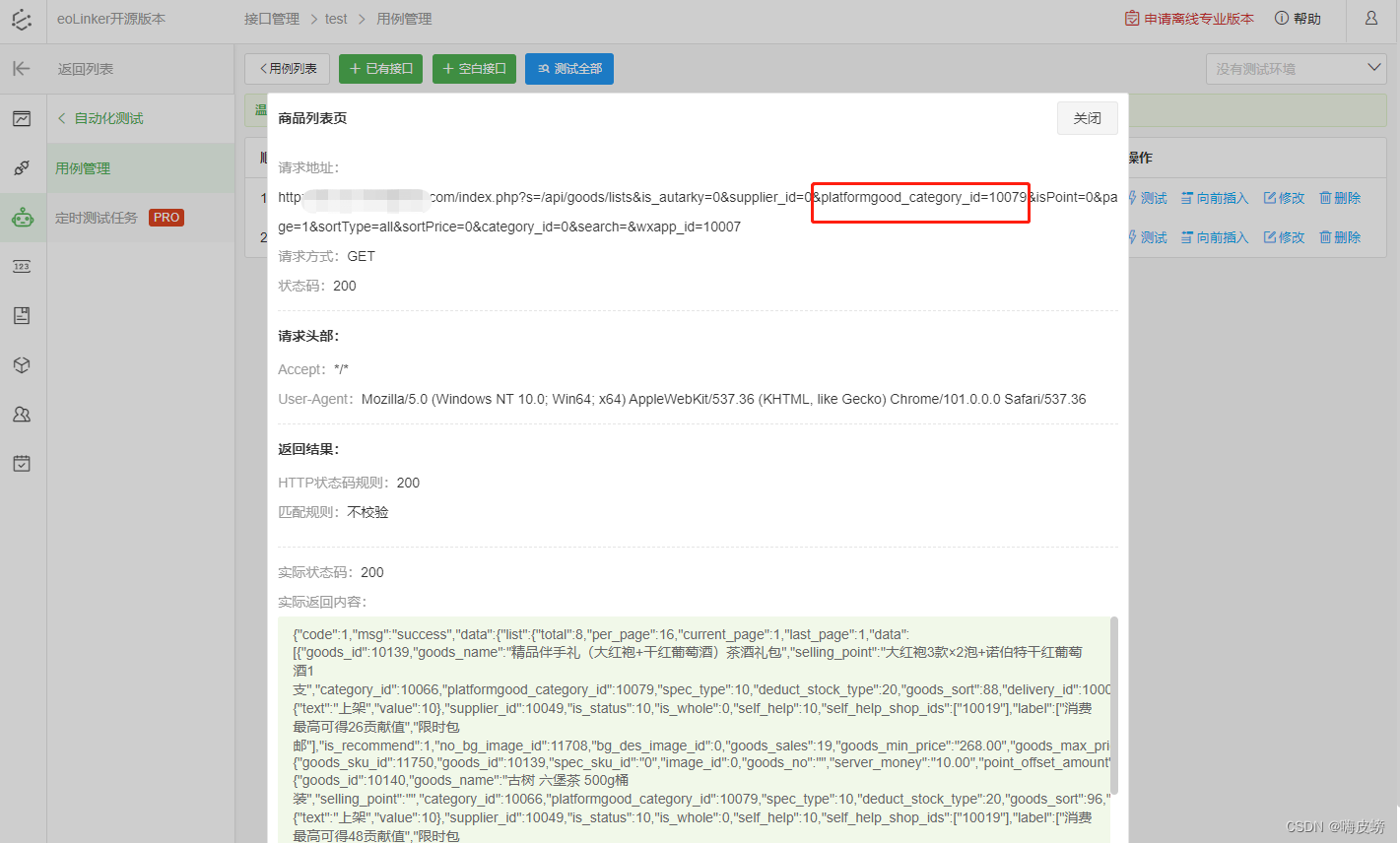 从测试接口详情可以看到,成功获取到了【接口1】返回的参数数据并写入到 【接口2】中的请求参数platformgood_category_id字段上。