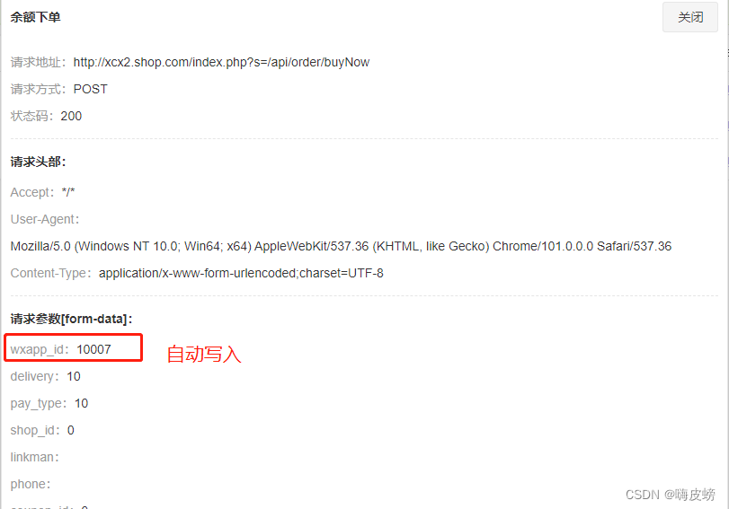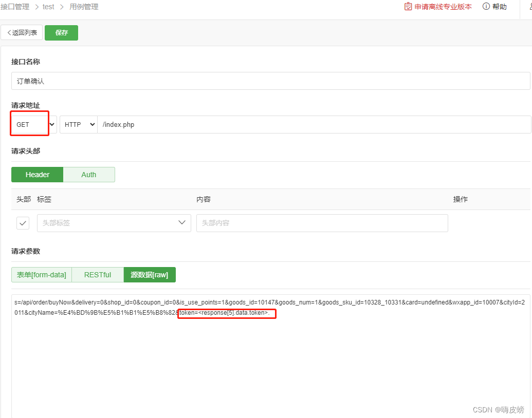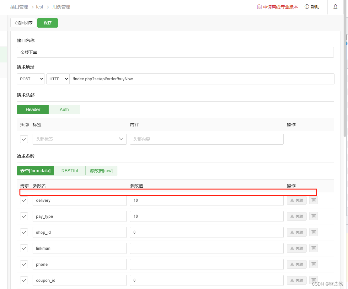 在添加测试api的时候,不需要重复添加 环境的请求Header头部和通用的额外参数,如wxapp_id参数就是所有请求都会添加并且固定值的参数,不需要每个测试api都填写。在测试的时候会 系统会自动把 环境请求Header头部和额外参数 都写入。