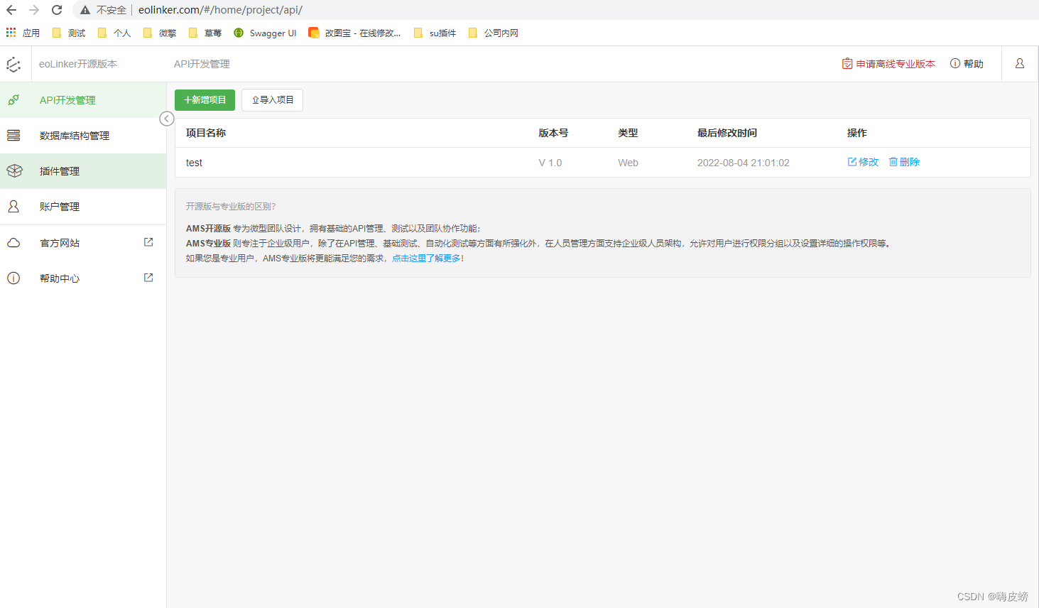 从gitee下载eolinker4.0源码下载的源码解压到网站根目录,配置站点创建数据库eolinker_os运行 https://项目/index.php 进行安装设置数据库账号密码后,点击下一步直到完成在数据库上执行sql语句添加管理员账号:admin密码:123456再次运行 https://项目/index.php 进行登录登录成功的界面:这里的test项目是我自己创建测试用的安装自动化测