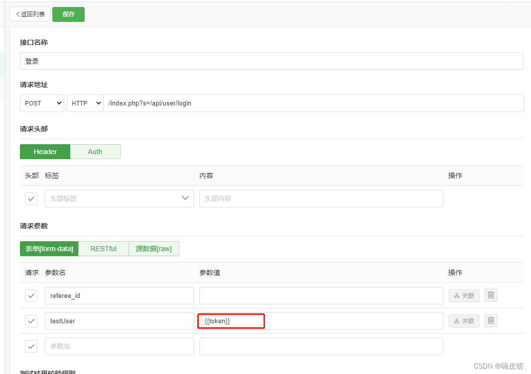 用于切换用户或者切换项目时使用,使用方式是在测试api接口参数填写{{全局变量名}},如我设置的是token遍历,那么使用的时候是{{token}}