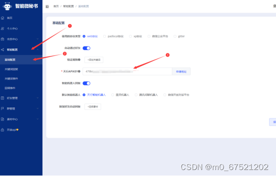 - 以上步骤完成之后登录智能微秘书 打开以下页面输入天行机器人的API 完成后保存
