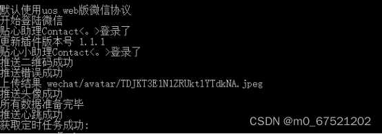 - 然后提示登录成功后所登录的微信号就开始工作了,你就可以拿另一个号测试发送信息给登录的这个号看看,可以自己对接其它api和定时推送,自定义消息回复等功能扩展,有疑问的可以联系我。
