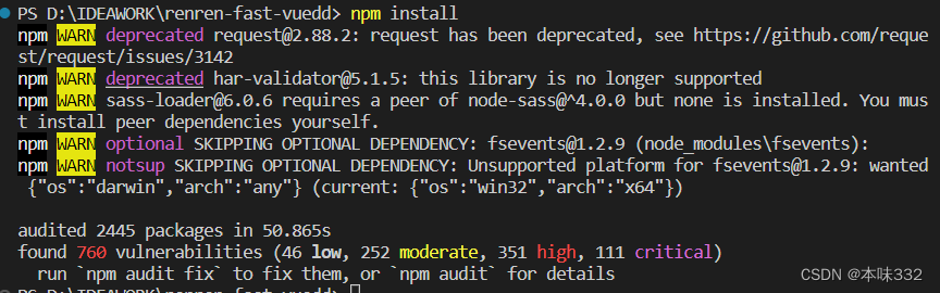 3.接下来要npm install如果没出现红色报错是这样的警告可以
