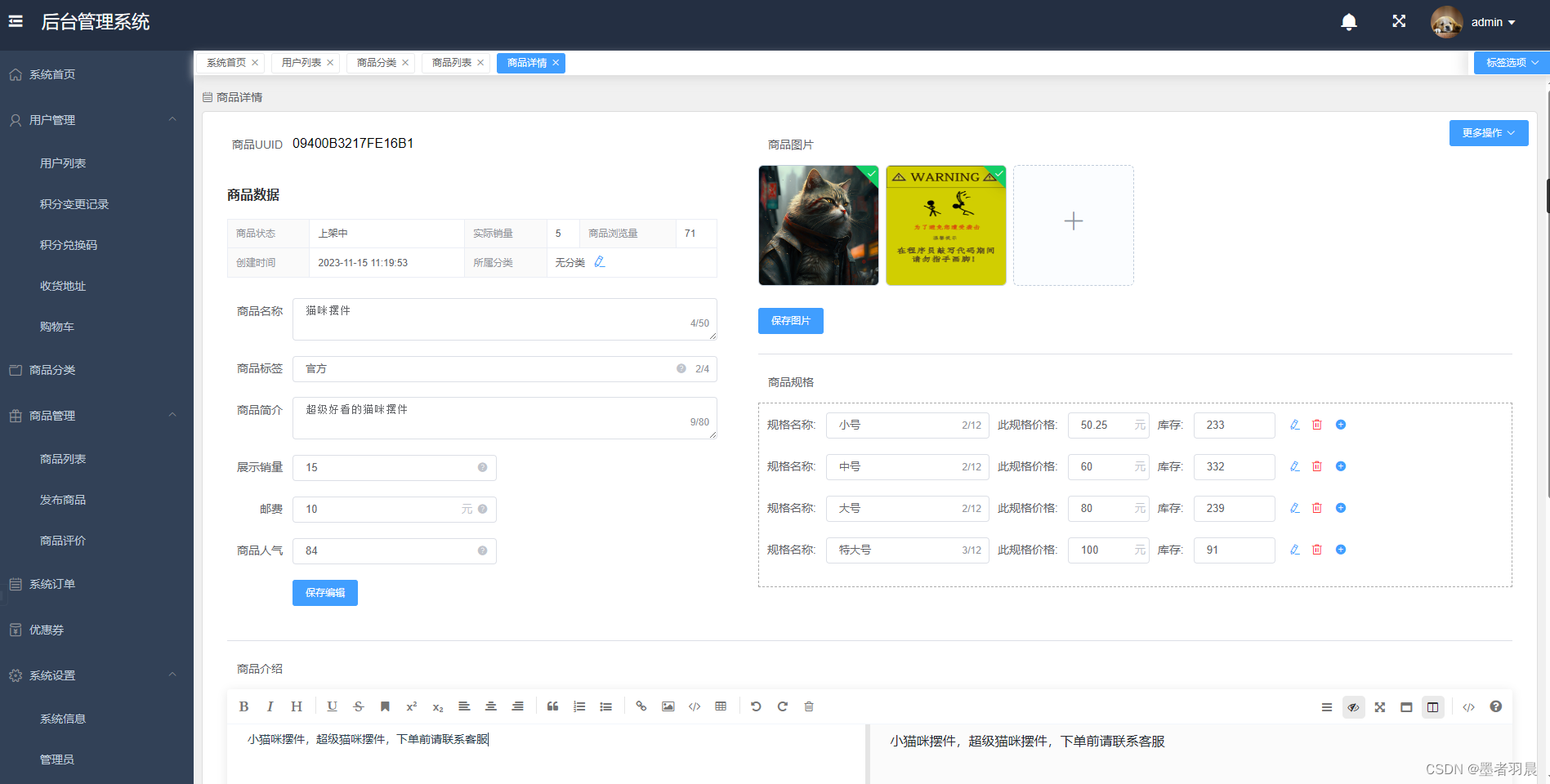 用户管理(封禁,评价,收货地址),商品管理(信息,销量,评价),商品分类管理,小程序首页轮播图,小程序公告设置,小程序首页推荐分类设置,订单管理,微信订单发货,订单退款,订单评价(可删评价),商品收藏,优惠券模块
