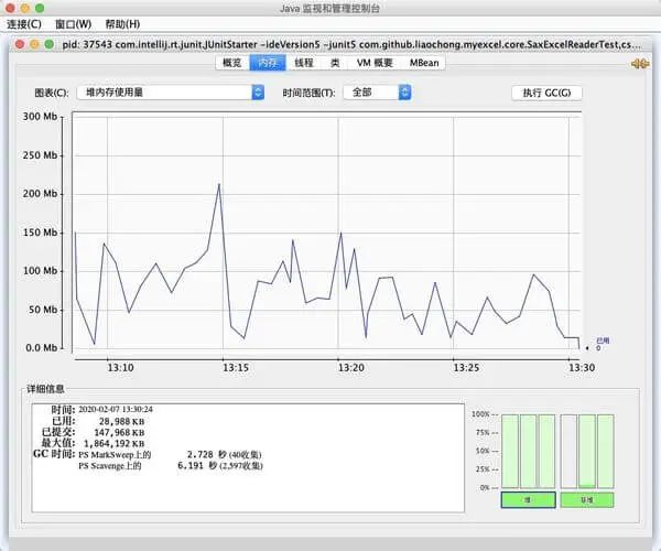 24.3M Excel,50 万行,8 列,循环 40 次读取,内存平均占用约 75 兆左右,与阿里 EasyExcel(V2.1.6)同文件测试对比,内存占用约为 MyExcel 的三分之一