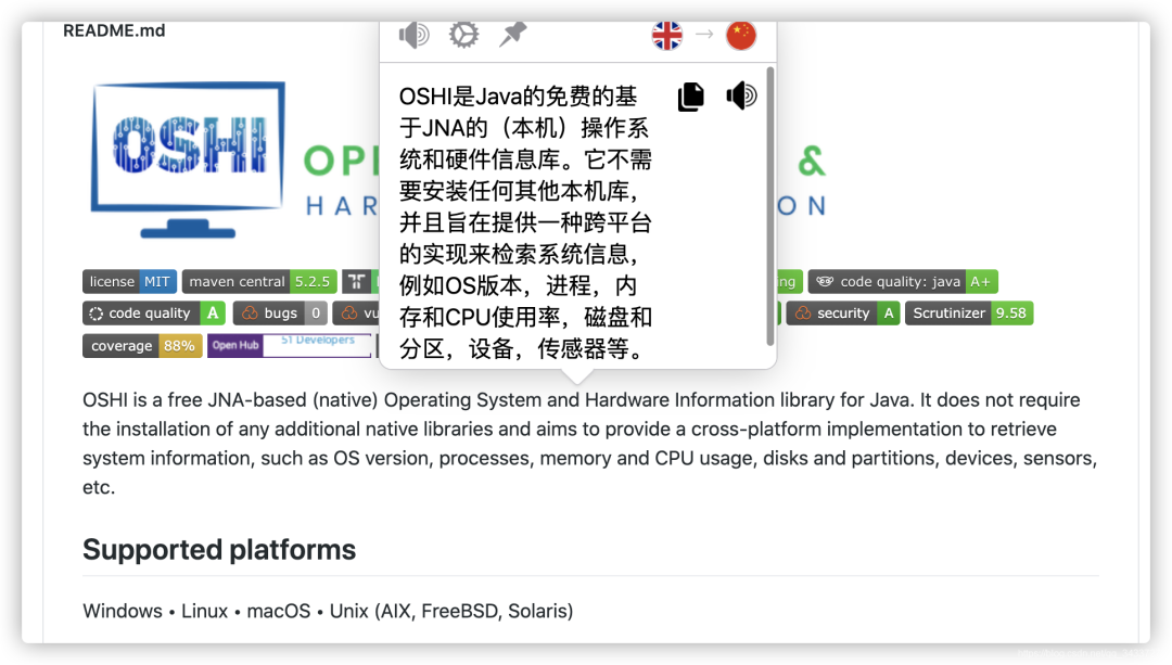 OSHI:一款为 Java 语言提供的基于 JNA 的(本机)操作系统和硬件信息库。