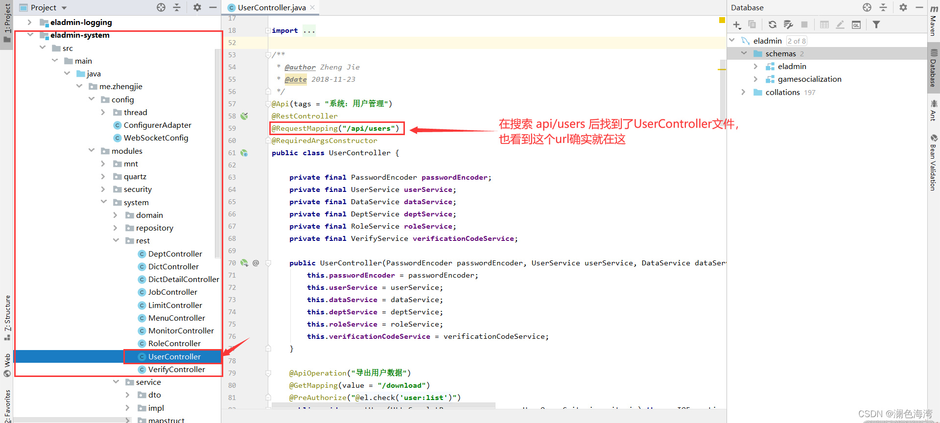 双击shift查找api/users就找到了和这个url相关的类,点进去确实这个url就在这