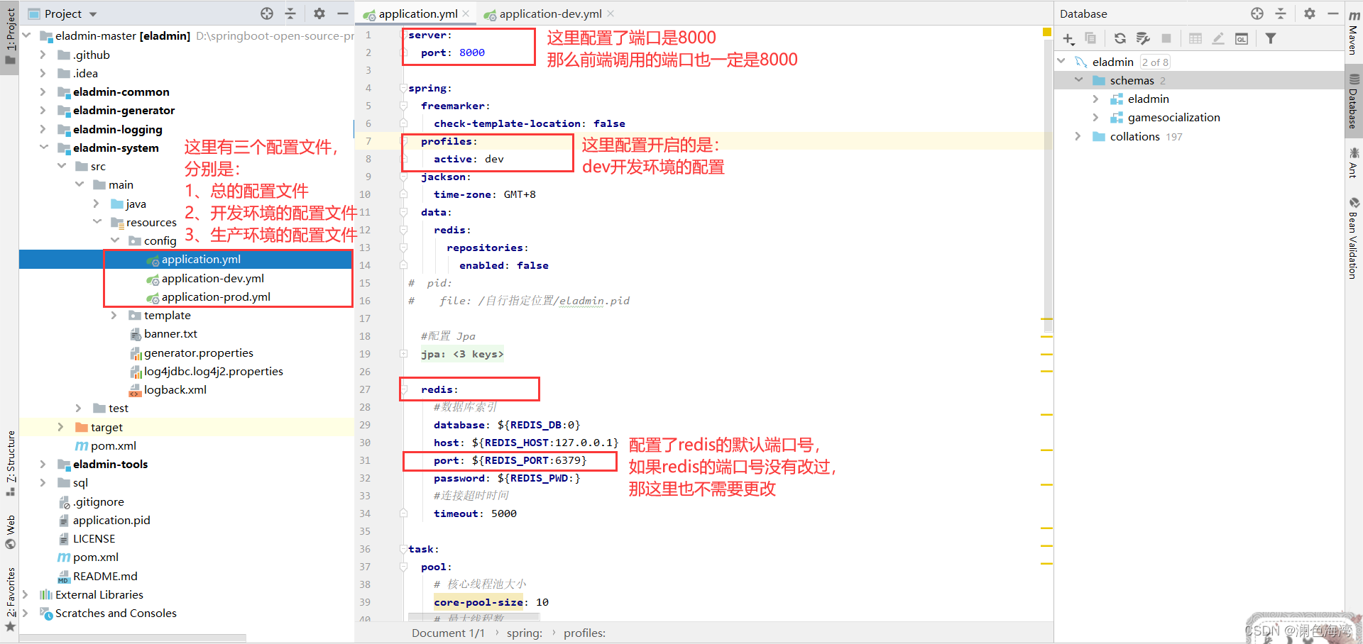 第四步:可以发现在 eladmin.sql文件的 sql 语句中并没有创建数据库的代码,只有创建表的代码,所以得先自己创建一个叫做eladmin的数据库。可以查看配置文件如下;