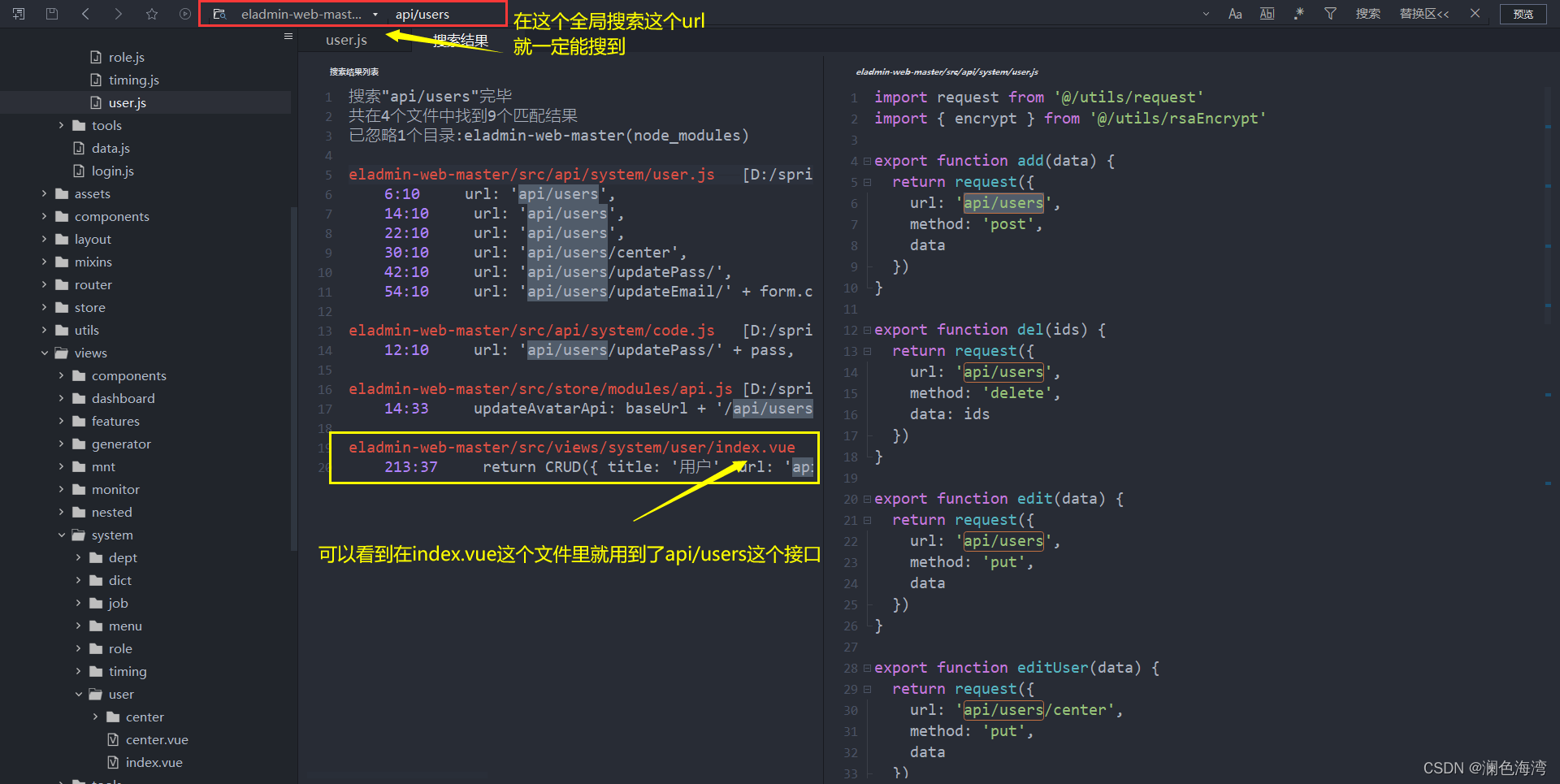 比如我们想要查看 api/users 这个 url 在哪里使用了,又是如何渲染的就直接全局搜索他即可