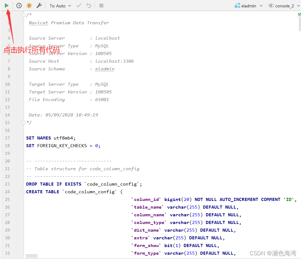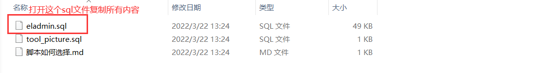第三步:找到之前下载的后端代码,找到sql文件夹,进去找到 eladmin.sql 文件,打开该文件复制里面的所有内容