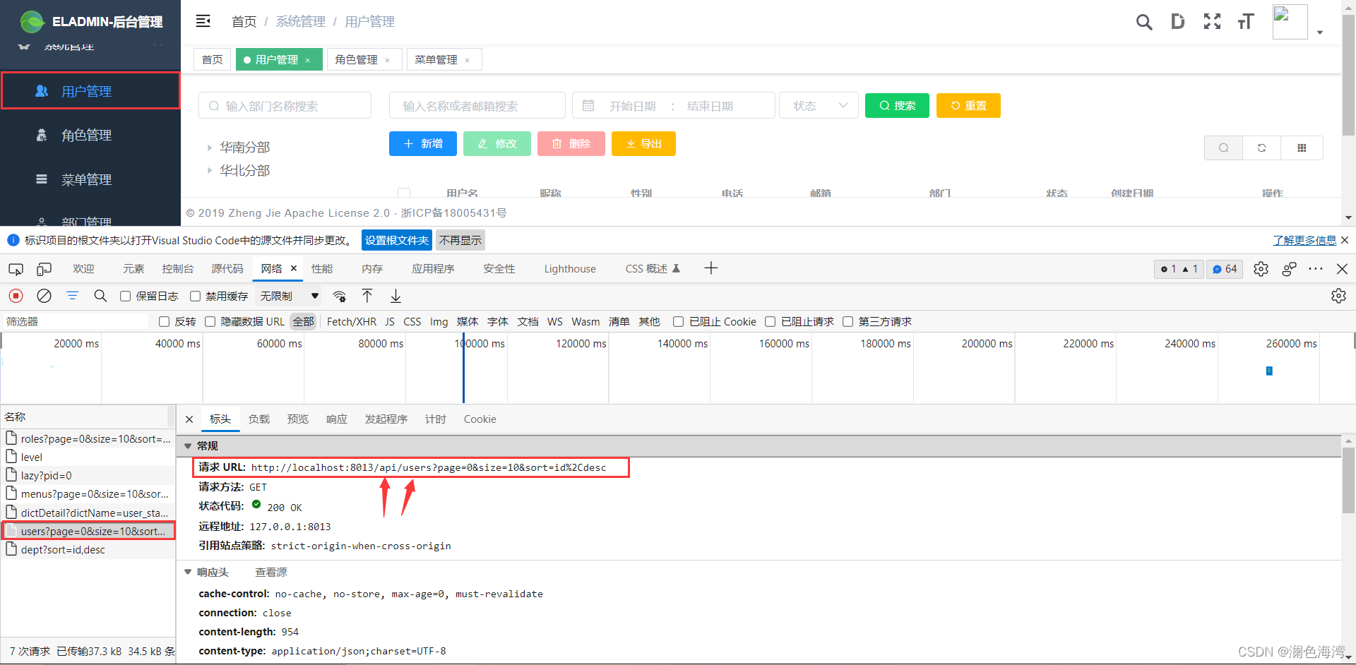 例如 进入首页后点击用户管理,可以看到网络发送了一个请求/api/user/,如下:
