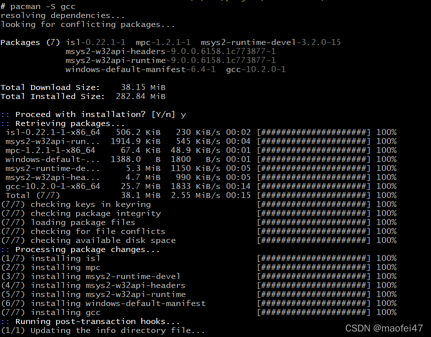 pacman -S nasm #汇编工具,安装 pacman -S yasm #汇编工具,安装 pacman -S make #项目编译工具,必须安装 pacman -S cmake #项目编译工具,必须安装 pacman -S diffutils #比较工具,ffmpeg configure 生成makefile时会用到,若不安装会警告,最好是安装 pacman -S pkg-config #库配置工具,编译支持x264和x265用到 pacman -S git #下载源码用,可以不安装,可自行通过其它方式下载源码 pacman -S base-devel # 安装基本开发组件,如果存在失败项则需要多次执行,直至安装完全即可 pacman -S binutils #包含ld等命令 pacman -S gcc