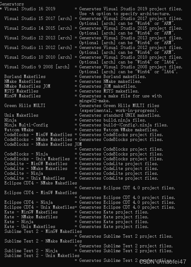 安装的不是vs2019版本的,也可以通过 cmake -G 查看对应的生成器
