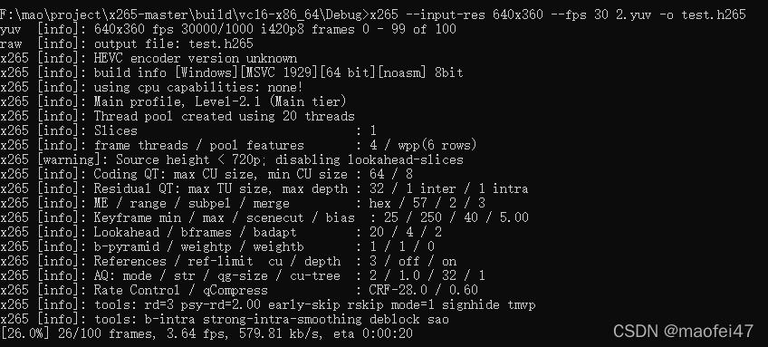 使用x265.exe --preset fast --input 2.yuv --fps 30 --input-res 640x360 --output out.bin --psnr --ssim --bitrate 128