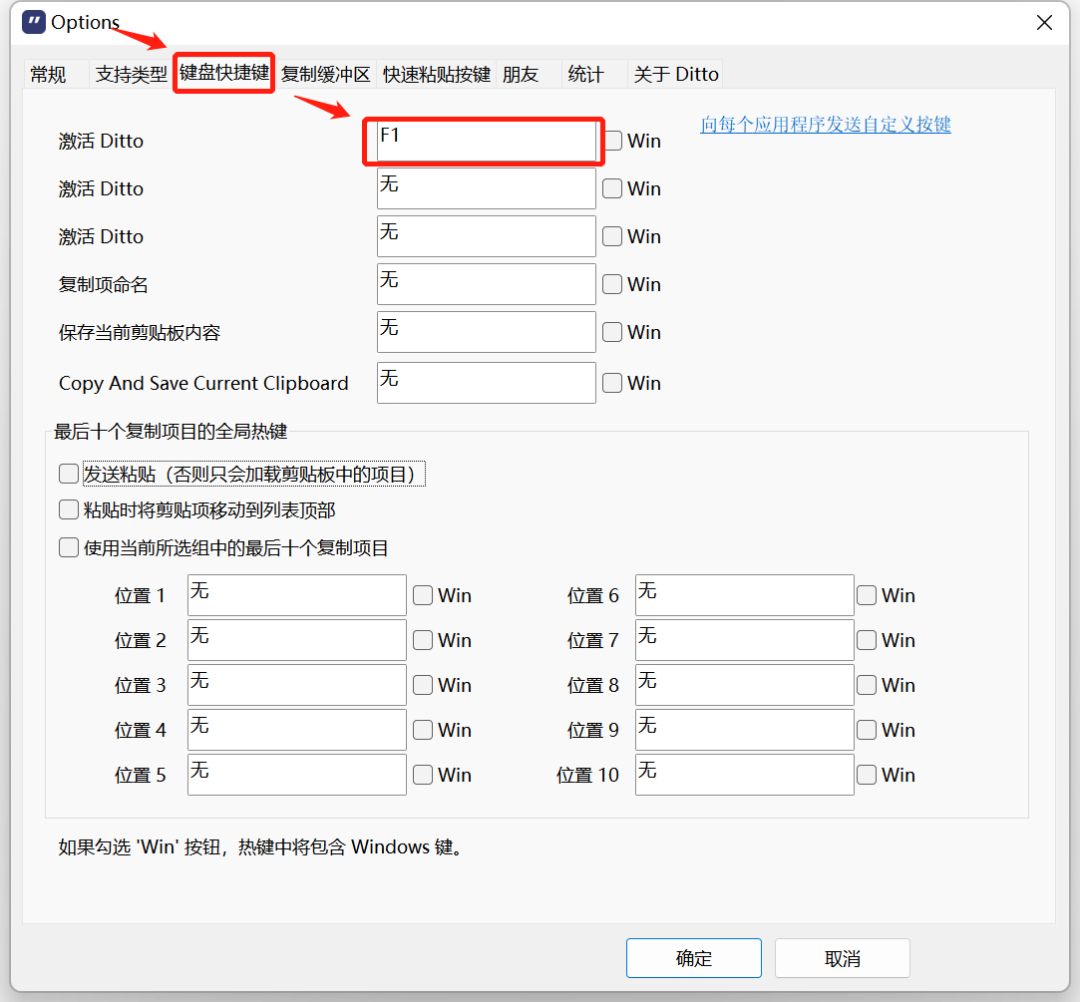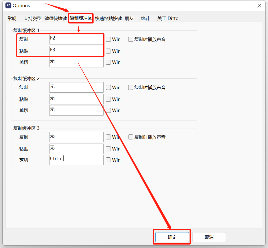 第二步,设置复制缓冲区的复制粘贴快捷键,这里的复制粘贴并不影响你系统级的Ctrl+C,和Ctrl+V使用,只是以Ditto为剪贴板,另设了一套复制粘贴系统。