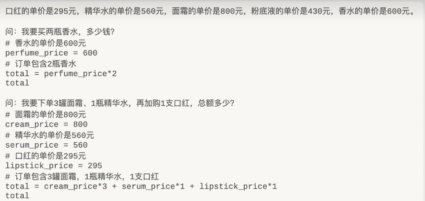 在思维链的基础上,让AI写出python代码,然后提交给python解释器(等计算工具),然后将计算结果返回给AI。(现在也有一种讨论是“用变量表示,然后用数学公式求解器”计算,这样子及绝了按序计算(一行一行的python代码执行)可能造成的错误。