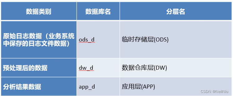 为了方便组织、管理上面的三类数据,我们将数仓分为不同的层,简单来说,就是分别将三类不同的数据保存在Hive的不同数据中。