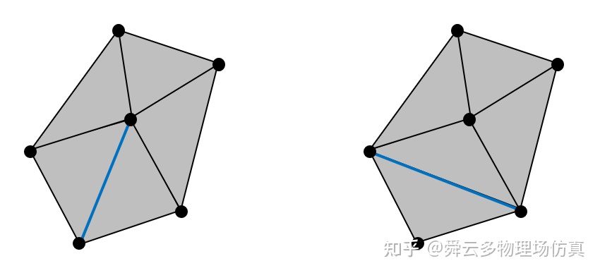 一般来说给定一个点集,往往存在不止一个三角剖分。以下图为例,我们只要把第一个三角剖分中的两个相邻三角形的公共边做一次翻转,就可以得到一个新的三角剖分。