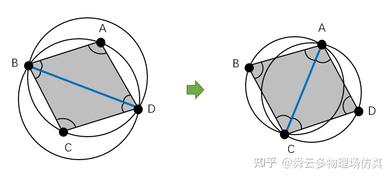 图4.经过一次翻转边操作后,两个相邻三角形的最小角增大了,而外接圆半径缩小了,这说明这次翻转边操作改善了三角剖分的质量。