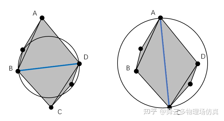 3.左图的边BD是局部Delaunay边,而右图的边AC不是局部Delaunay边。