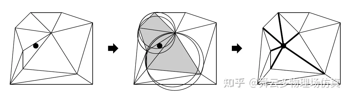 图5.左图:原Delaunay三角剖分及新插入的顶点v,中间:所有外接圆包含顶点v的三角形构成一个星形多边形,右图:将星形多边形内部的三角形删除,并将v与空穴顶点重连后得到的新三角剖分,这是一个包含顶点v的Delaunay三角剖分。