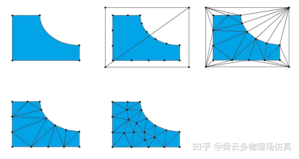 图7.从上至下,从左至右依次为:1)参数区域 2)由包围盒生成的初始三角网格及边界曲线上生成的边界点3)将边界点逐一插入并调整后得到的Delaunay三角网格 4)去除辅助顶点及相连的三角形得到的关于边界点的Delaunay三角网格5)加入内部点之后得到的完整Delaunay三角网格。