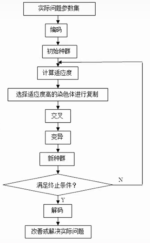 首先将问题的解进行编码以适配GA,产生初代种群,在每一代中根据适应度大小选择个体,并借助遗传算子(genetic operator)进行交叉和变异,产生代表新解集的种群,末代种群的最优个体经过解码,作为问题近似最优解。