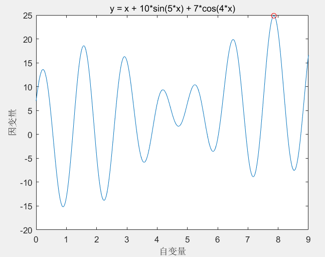 一元函数优化,默认为求最大值,如果要求最小值将适应度函数取倒数或者取负号