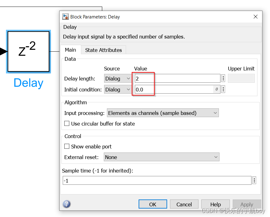 如下图所示,双击delay模块,可以设置其Delay length和Initial condition,Delay length即对输入信号延迟的步长数量,Initial condition即delay模块的初始值,因为delay模块是对输入信号延迟输出,那么当软件第一次运行时,此时应输出的值,即由此处的初始值决定。