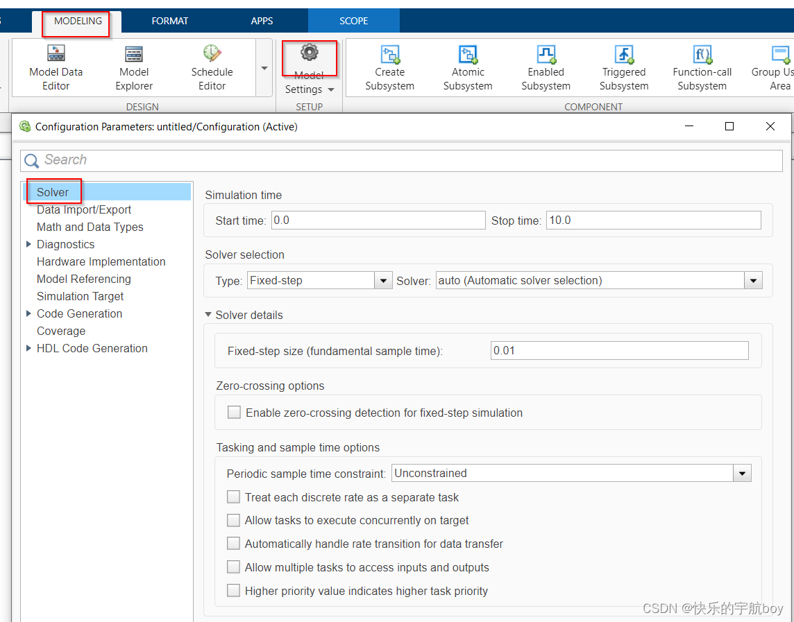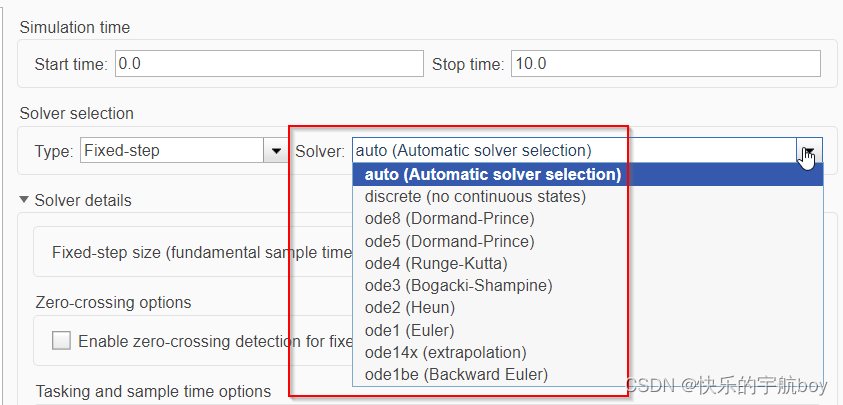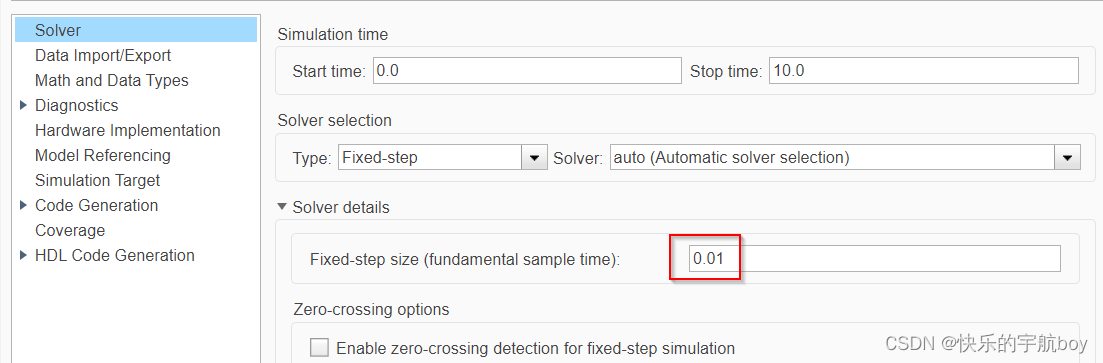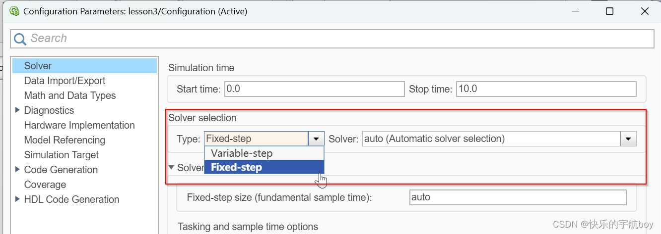 选择Type为Fixed-step后,会出现Fixed-step size的配置项,即仿真步长,可以理解为函数(模型)的调用周期。以嵌入式软件开发为例,如果你开发的模型是一个周期函数,则此处的仿真步长就是函数被调用的周期。例如仿真步长设置为0.1s,那么每100ms,这个模型会被执行一次。